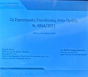 During the seminar, Chara Zerva and Dr. Dimitra Anagnostopoulou delivered a comprehensive overview of the regulatory framework governing strategic investments, reflecting the most recent legislative amendments and case law developments. Through the valuable experience they have gained from advising and managing complex investment schemes, they provided participants with meaningful guidance on how to address legal and procedural challenges in practice.